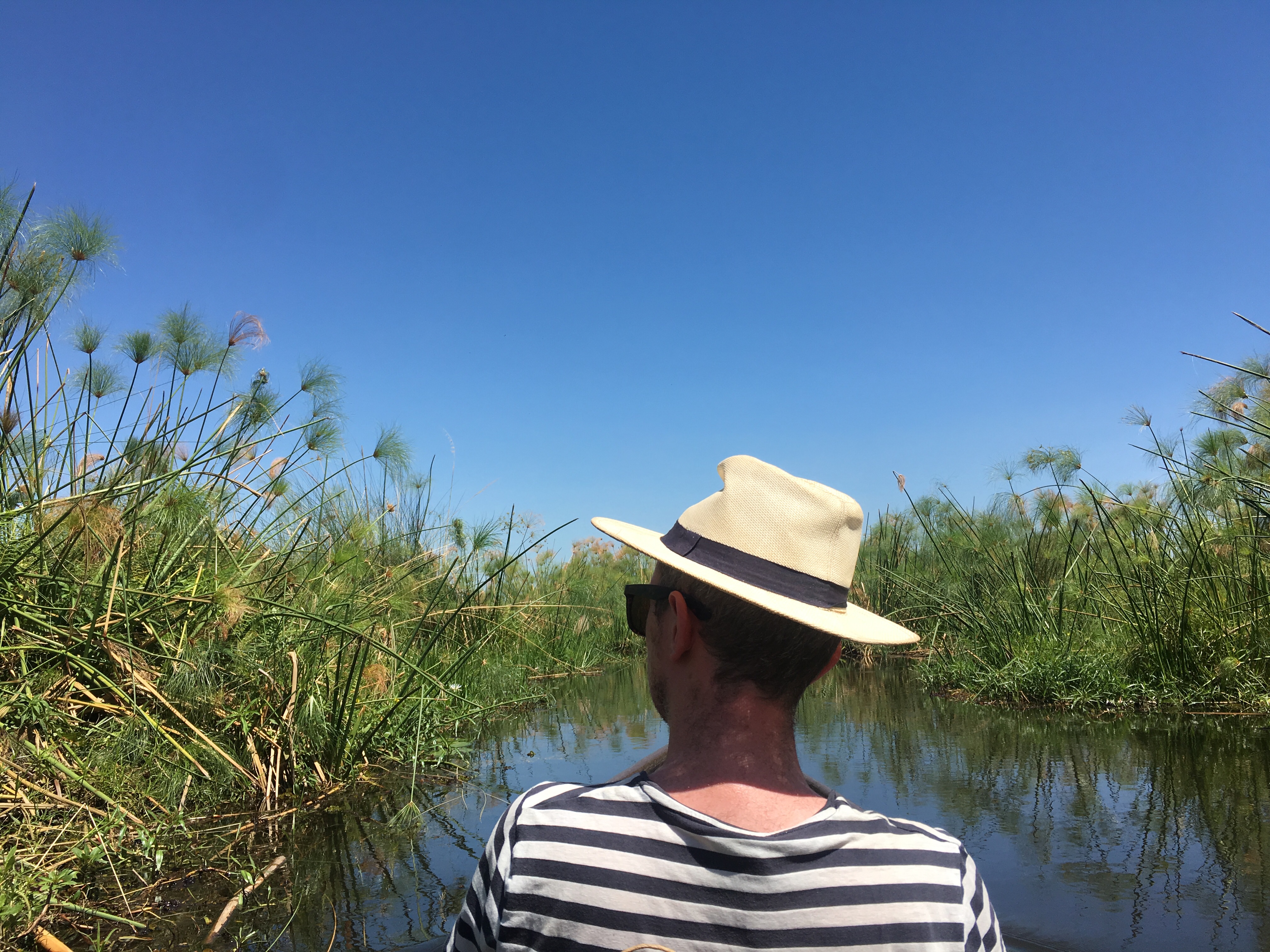 We were taken on a two hour journey to a Mokoro Station, with an “African massage” en route – (N.B – African massage is the local term to describe the massage you receive when travelling on a bumpy road). We picked up Carlson, our Mokoro captain for the day and set off in our boat in the baking sun through the reeds, rushes and lily pads. Carlson was no more than eighteen but we put our trust in him to keep us safe along the crocodile infested waters. The Delta was stunningly beautiful. After an hour of serene floating, we docked ready for a safari walk on dry land. When we asked Carlson, do the animals ever hunt humans around these parts, his response was, “No…but a man from the village was chased and killed by an elephant just last week.”